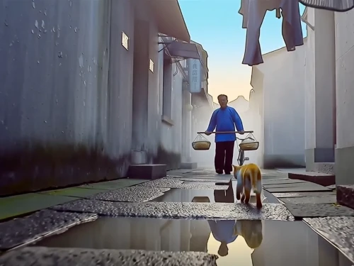 「旧弄堂,晨雾,镜头跟拍橘猫,猫踩过水洼发出啪嗒声,远处传来小贩吆喝,上海口音,声音由远及近」